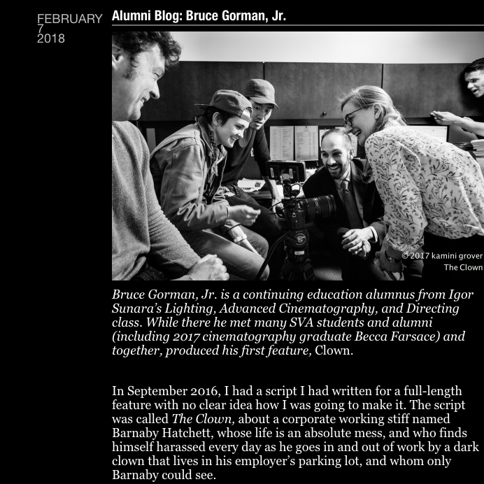 Bruce Gorman, Jr. featured on the SVA Film & Animation Alumni Blog for his work on The Clown. Full story available on the SVA blog.